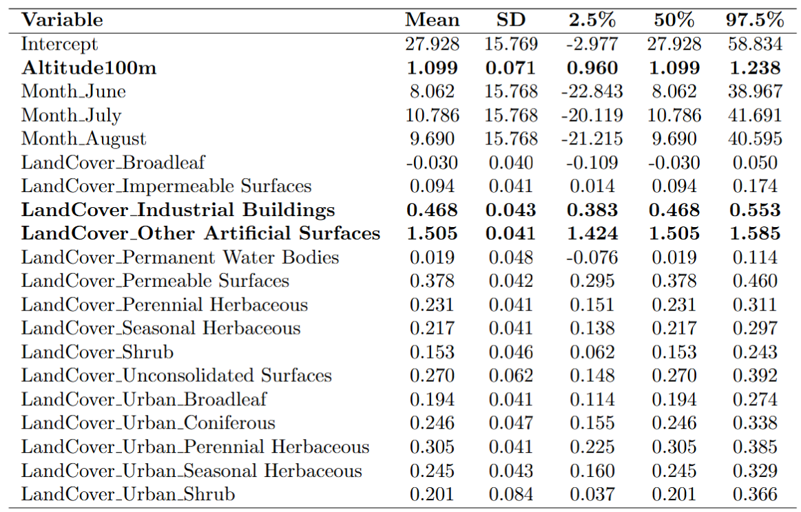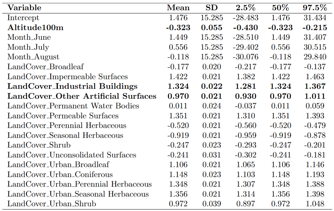 The tables below presents the posterior estimates (mean, standard deviation, and 95% credible intervals) for the following fixed effects included in the models: